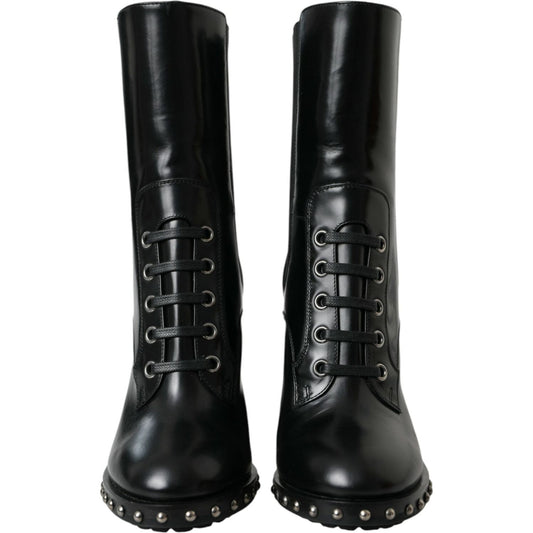 Dolce & Gabbana Black Leather Combat Mid Calf Boots Shoes