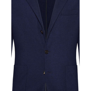 navy blue cashmere notched lapels front button fastening long sleeves buttoned cuffs jetted chest pocket two side patch pockets English rear vents Cashmere single-breasted jacket