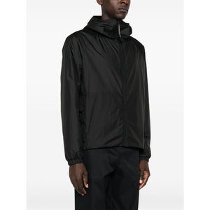 black ripstop texture padded design classic hood long sleeves elasticated cuffs two side zip-fastening pockets two side slit pockets logo print to the side high-low hem front two-way zip fastening Hooded padded jacket Size and Fit - This piece fits true to size. We recommend you get your regular size. Model is 1,84m / 6ft 1in wearing size M