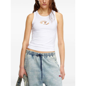 white stretch organic cotton jersey texture Oval D logo plaque crew neck sleeveless straight hem T-Lynys cotton top Size and Fit - LENGTH: 51.0 Centimetres. BUST: 74.0 Centimetres.