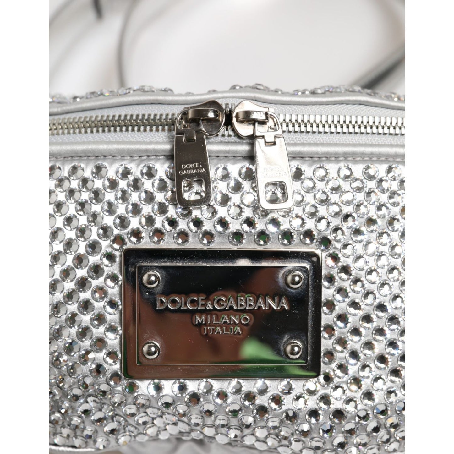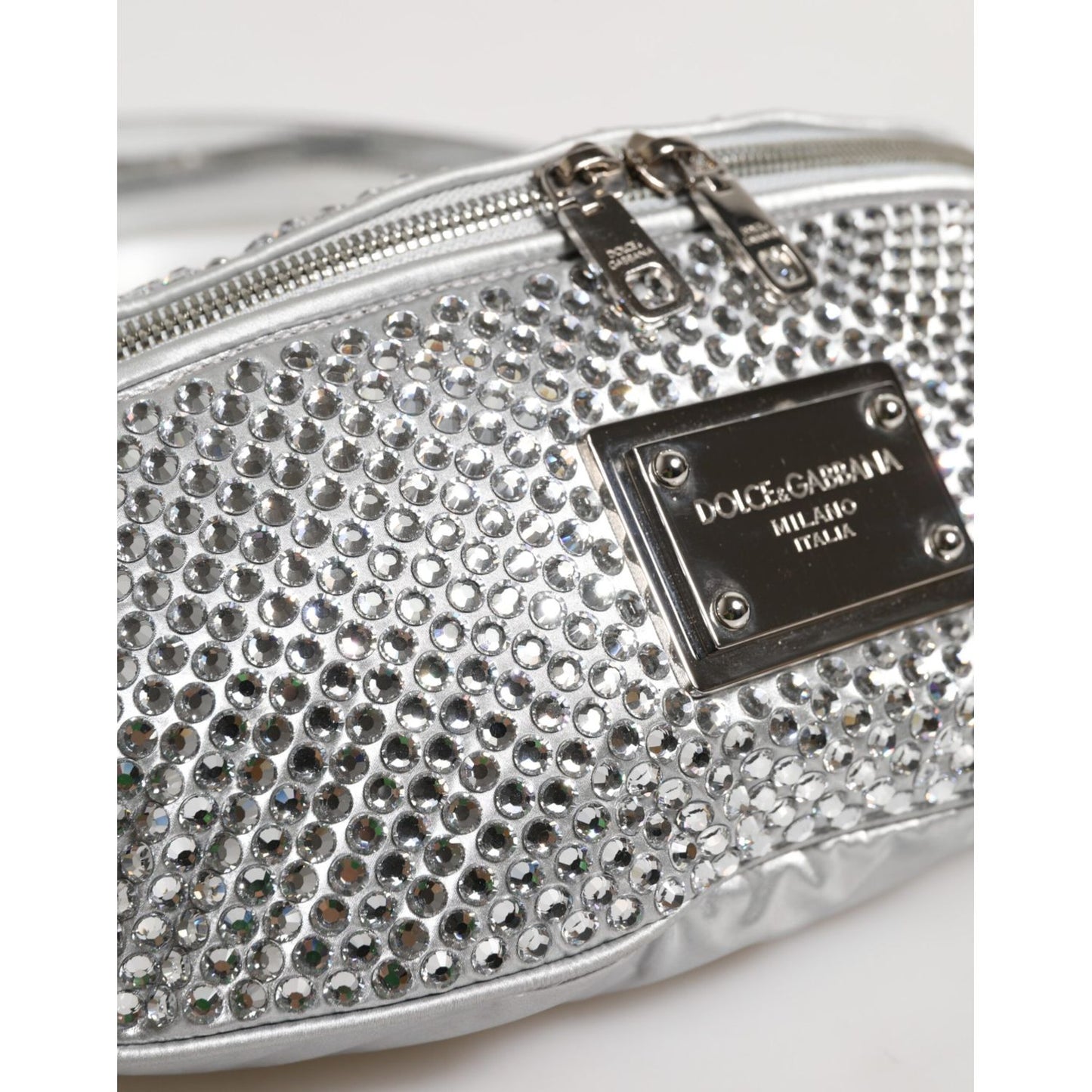 Gorgeous brand new, 100% Authentic Dolce & Gabbana Silver calf leather belt bag featuring crystal embellishment, silver-tone hardware, logo plaque, single flat top handle, adjustable waist strap, adjustable detachable shoulder strap, front zip fastening, main compartment and internal slip pocket.