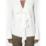 white silk semi-sheer construction signature 4G monogram jacquard ruffled trim plunging V-neck flounce sleeves with buttoned cuffs straight hem Silk ruffled blouse Size and Fit - This piece fits true to size. We recommend you get your regular size. Model is 1,75m / 5ft 8in wearing size 36 (FR)
