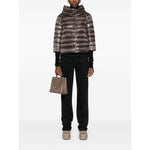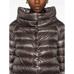 grey glossy finish goose down padded design funnel neck concealed front press-stud fastening three-quarter length sleeves two side slit pockets straight hem full lining Sofia nylon cape