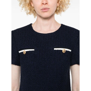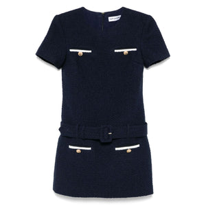 navy blue concealed rear zip fastening two chest welt pockets two front welt pockets belted waist Boucle mini dress Size and Fit - This piece fits true to size. We recommend you get your regular size. Model is 1,75m / 5ft 8in wearing size 8 (UK)