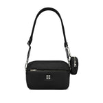 black adjustable shoulder strap detachable mini pouch front zip pocket silver-tone hardware Virginia nylon shoulder bag Size and Fit - Width 23 cm, Height 15 cm, Depth 7 cm, Shoulder strap 100 cm